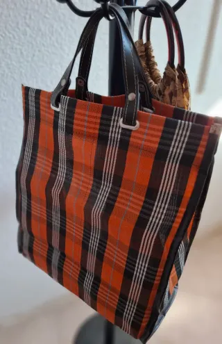 Conjunto de dos bolsas de compra con un estilo vintage. - Una bolsa presenta un estampado de cuadros en tonos naranjas y negros. - La otra bolsa tiene un diseño con motivos de hojas y elefantes en tonos marrones y beige con asa. Usado, buen estado.