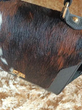 Bolso de piel genuina con un diseño llamativo. - Combinación de cuero negro y pelo con estampado. - Cierre metálico dorado.