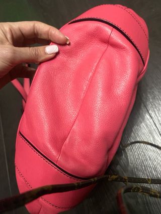 Bolso Vintage / Bandolera / Bolsa 2 en 1. Este versátil bolso Loewe Madrid está hecho de suave cuero rosa, ofreciendo un toque vibrante y lujoso. Diseñado para la flexibilidad, se puede llevar tanto como bolso de mano como bandolera. El exterior de cuero rosa está en excelente estado con solo manchas menores. El interior forrado en lona negra está dividido en tres compartimentos, añadiendo conveniencia y organización. Ver fotos