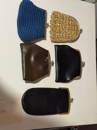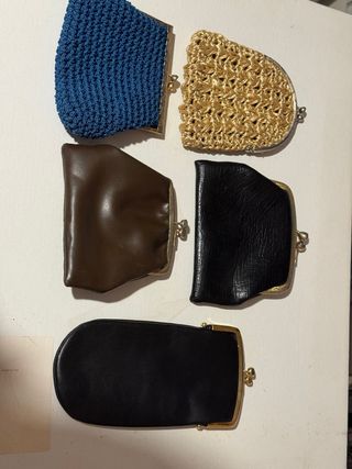 Lote de cinco monederos vintage. - Monedero de ganchillo azul. - Monedero de ganchillo dorado. - Monedero de piel marrón. - Monedero de piel negro. - Monedero grande de piel negro.