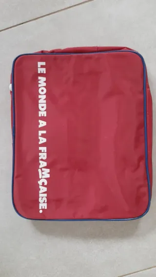 Bolso vintage con un diseño llamativo y práctico. - Cierre con clip. - Ribete azul. - Estampado Fram Le Monde a la Francaise con palmeras.