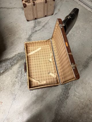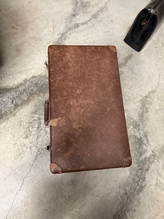 Maleta antigua con un diseño clásico y atemporal. Perfecta para decoración o coleccionismo. - Material exterior de tela resistente. - Detalles en cuero en las esquinas y asas. - Cierres metálicos.