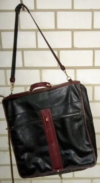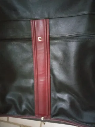 Elegante portatrajes vintage de Pierre Cardin. - Confeccionado en piel. - Detalle de banda en color rojo. - Logo de la marca integrado. - cremallera en ambos laterales. - gancho superior. Tiene un ligero desgaste en el asa.