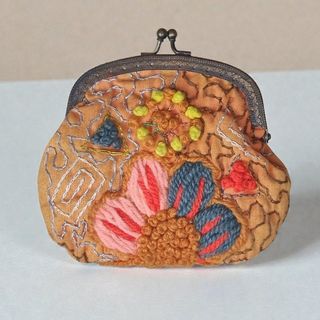 La superficie está profusamente decorada con una técnica de bordado mixto o crazy quilting, que combina diferentes grosores de hilo y puntos, estilo vintage. El interior está forrado con una tela de satén crema con un brillo sutil, lo que proporciona un contraste lujoso con el exterior rústico bordado. El monedero es una pieza única que irradia un estilo bohemio, artístico y nostálgico. La combinación de texturas (la lana gruesa, el bordado fino y el satén brillante) y la paleta de colores apagados y terrosos con toques brillantes lo convierten en un accesorio llamativo.