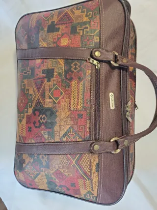 Elegante bolsa de viaje Samsonite con un diseño vintage y estampado geométrico. - Estampado multicolor con motivos geométricos. - Ribetes y asas en tono marrón. - Cremallera frontal con tiradores metálicos.