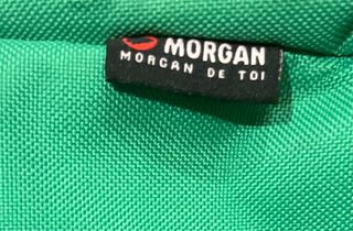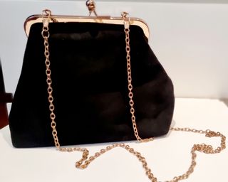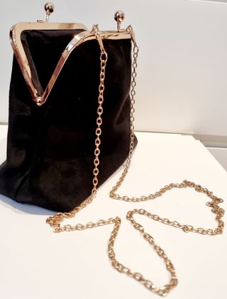 Bolso en color negro, tela anyerina con forja dorada. Tiene un ancho de 15 cm en la parte superior, 21 cm en la parte inferior y un alto de 18 cm. Dispone de dos asas de cadenas doradas. Una de 1,20 metros y otra de 36 cm.