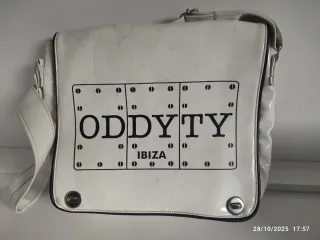 Bolso de estilo vintage con un diseño llamativo. - Color blanco brillante. - Detalle frontal con el nombre ODDYTY y IBIZA. - Cierre de solapa con broches metálicos. - Correa ajustable para llevar al hombro.