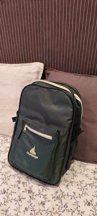 Mochila picknick vintage equipada para 2. Contiene: 2 platos, 2 cuchillos, 2 tenedores, 2 cucharas, 2 tazas, un abrebotellas, un mantel, 2 servilletas, una tabla para apoyar. Otro compartimento vacío para más cosas. Laterales para sujetar botellas. Perfecta para excursiones en pareja.
