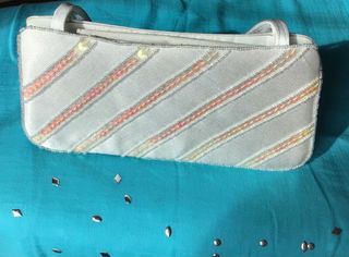 Elegante bolso de mano ideal para ocasiones especiales. - Asa de mano arqueada. - Detalles de pedrería en los pomos del asa. -Tapa tipo sobre con cierre de broche imantado. - Incluye asa de cordón para colgar al hombro. - Diseño sofisticado y atemporal. - Vintage, años 90.
