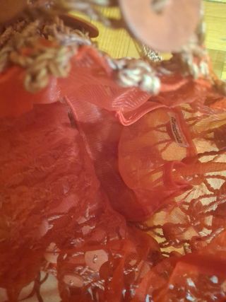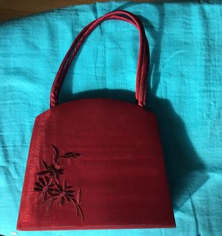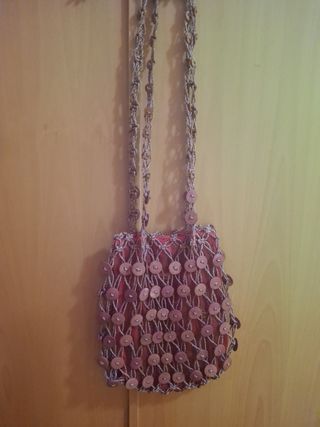 Bolso vintage de los años 80, con un diseño único y llamativo. - Elaborado con hilo y adornado con botones. - forro de gasa roja transparente.