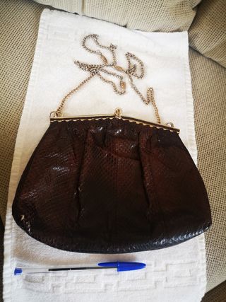 Bolso piel marrón con textura d escamas. Vintage. Cadena dorada para colgar. Cierre tipo broche, metal (hermético), está un poco apretado. Interior, parece piel y con un bolsillo. Tono marrón, más oscuro por abajo. Marca ESTEVE, hecho en España. Bien conservado. 10€/HAGO ENVÍOS Medidas: 24 cm. Largo abajo 18 cm. Largo arriba 19 cm. Alto con cierre (Una esquina tiene un punto desgastado. Tb desgastados fuelles, junto al cierre. Cadena colgar, en algunas zonas, descolorida, está plateada en vez de dorada).