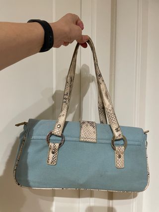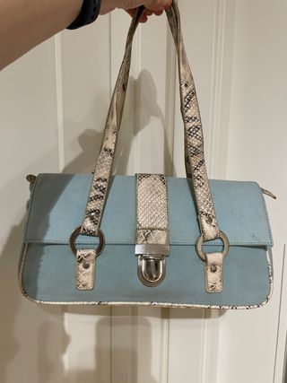 Bolso de hombro con un diseño moderno y elegante. - Combinación de tonos azules y beige. - Detalle de estampado de serpiente en las asas y solapa. - Cierre metálico frontal.