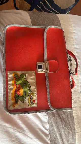 Mochila cartera vintage con un divertido diseño de rana. - Cierre de hebilla metálica. - Detalle de parche con la rana 'Ribbit'. - Ribete plateado en los bordes. - Nunca usada.