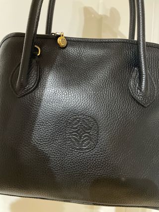 Elegante bolso de mano en piel negra con una textura granulada muy característica. Cuenta con un discreto logo grabado en el frontal y un charm metálico dorado colgando de la cremallera. Bastante antiguo - Piel texturizada. - Color negro. - Logo grabado. - Charm metálico dorado. No tengo la correa de colgar