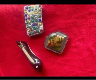 Monederos antiguos: El cuadrado es de piel de los años 40, era de mi abuela es con apertura giratoria para meter y sacar las monedas y poder abrirle o cerrarle, en el exterior esta pintado a mano, es un monedero de la epoca hecho por un artesano El zapatito es de los años 60 y es de charol El rectangular es de los años 70 y es de abalorios