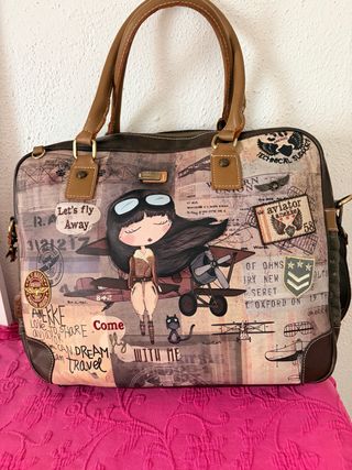 Bolso de la marca Anekke con un diseño inspirado en aviadores y un estilo vintage......nuevo a estrenar - Estampado con motivos de viajes y aviones. - Combinación de colores marrón y verde oliva. - Cierre de cremallera principal. - Asas de mano cómodas.