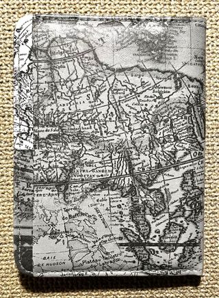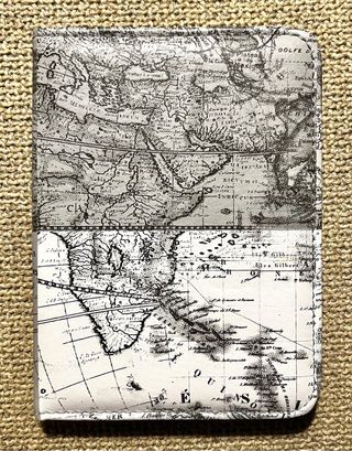 Funda para pasaporte con un diseño de mapa antiguo. Protege tu documento de viaje con estilo. - Diseño de mapa detallado. - Acabado en blanco, gris y negro.