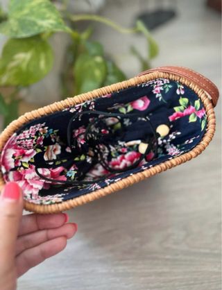 Bolso de mano vintage con un diseño único. - Tejido de ratán. - Forro interior con estampado floral. Precioso bolso vintage con bolsa interior de tela con bonitas flores!! Comprado en Tarifa junto al mar. Usado un par de veces. Cordón de colgar en polipiel. Medidas Ancho 22 cm Alto 17.5 cm Fondo 9.5 cm Largo cordón colgar 59 cm #bolso #vintage