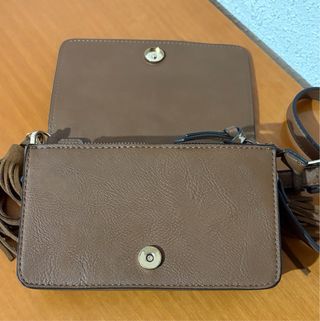 Bolso de piel en tono marrón, con un diseño vintage y detalles de flecos. - Material: Piel. - Color: Marrón y beige. - Cierre de cremallera. - Bolsillos exteriores con cremallera. - Interior forrado, con divisiones y bolsillo con cremallera - Adornos de flecos y anillas metálicas.