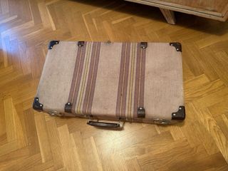 Maleta de estilo vintage con un diseño clásico y elegante. - Acabado en tela - Rayas verticales en tonos marrones y ocres. - Cierres metálicos y asa de mano.