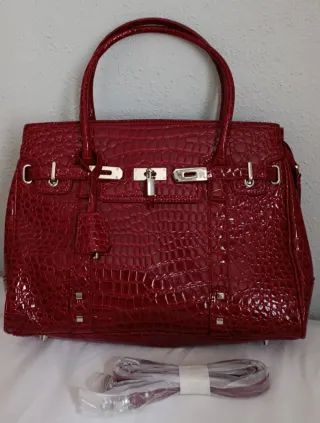 Elegante bolso de mano con un diseño inspirado en el estilo Birkin. Cuenta con un acabado texturizado que imita la piel de cocodrilo y herrajes metálicos plateados. - Asa superior. - Cierre de solapa con broche. - Incluye correa de hombro desmontable. - Por dentro tiene varios departamentos con cremallera. Está nuevo sin estrenar. Medidas: 37 x 27 x 12 cm + el asa