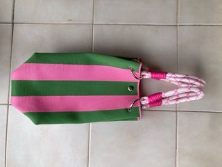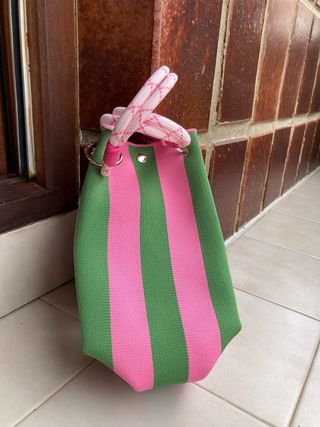 Bolso de tela con un diseño llamativo de rayas verticales rosa y verde - Estilo japonés. - Asas de cuerda. - Combinación de colores vibrantes.
