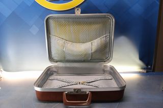 Maleta vintage de gran tamaño, con un diseño clásico de los años 50. Ideal para coleccionistas o como elemento decorativo. - Material exterior resistente. - Asa de transporte de cuero. - Cierres metálicos.