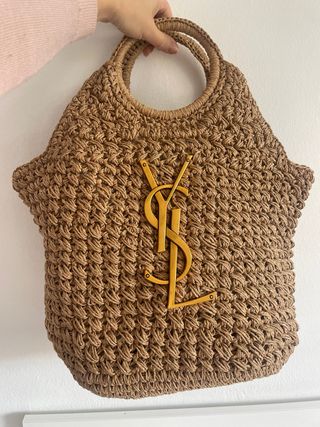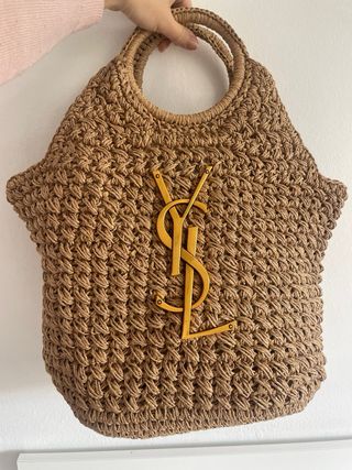 Bolso de mano de paja con el icónico logo de Yves Saint Laurent. - Material: Paja - Color: Marrón y dorado - Diseño tejido - Asas redondas