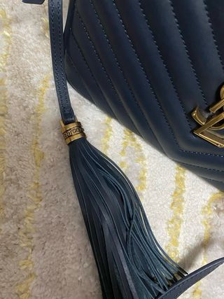 Elegante bolso de la marca Saint Laurent. - Diseño acolchado en chevron. - Detalle de logo YSL en dorado. - Adorno de flecos. - Correa de hombro. - Color azul marino.