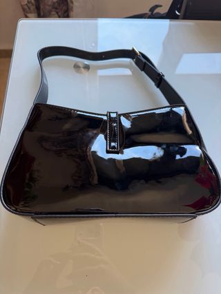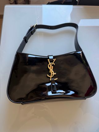 Elegante bolso de Saint Laurent en charol negro. - Acabado brillante. - Detalle de logo YSL dorado. - Correa ajustable.