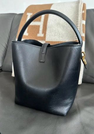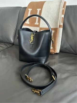 Elegante bolso de mano y bandolera de Yves Saint Laurent. - Diseño bucket. - Logo YSL dorado. - Asa superior y correa ajustable. - Acabado en piel lisa. -Modelo le 37 en piel -13cm*15*8