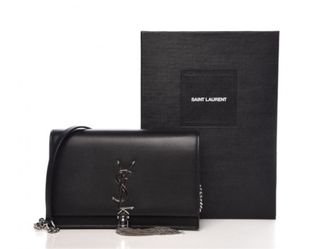 Bolso Saint Laurent Kate de segunda mano en piel negra lisa, con logo YSL dorado y borla de cadenas metálicas. Modelo icónico de la firma Saint Laurent, ideal como bolso de mano elegante para eventos o cenas. Tiene un diseño compacto de 19 x 13 x 4 cm con ranuras interiores para tarjetas y cierre magnético. Está en muy buen estado, con ligeras marcas de uso visibles solo en el exterior. Perfecto para quienes buscan un bolso Saint Laurent original de segunda mano con estilo y autenticidad. Barcelona 0550