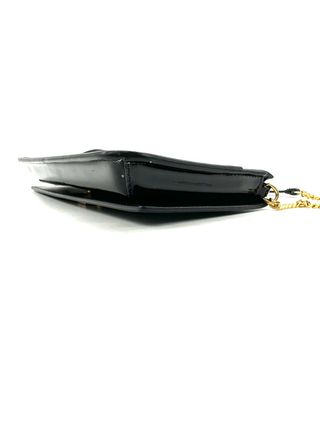 Bolso bandolera Saint Laurent en piel charol negra con logo YSL dorado en el frontal y cadena metálica dorada. Diseño elegante y sofisticado, medidas 18 x 10 x 2 cm, ideal para eventos o uso de noche. Interior en piel negra con cierre magnético. En buen estado, con ligeras marcas de uso. Ref. BCN 712 – Barcelona.