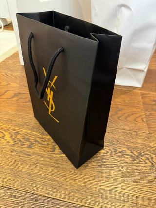 Cualquier duda, preguntad sin problema Escucho/Acepto ofertas ! 😊 Lo que se ve en la foto es la bolsa donde venía. Juraría que sigo teniendo la caja donde venía con la bolsa guardapolvos, las tarjetas..., según sepa lo edito u os lo comento cuando pregunteis :) - Color marrón. - Detalles en dorado. - Asa superior. - Adorno de logo YSL.