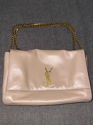 Elegante bolso de hombro de la marca Yves Saint Laurent. - Confeccionado en piel de alta calidad. - Acabado en un sofisticado tono beige. - Detalles metálicos en dorado. - Cadena dorada para llevar al hombro.