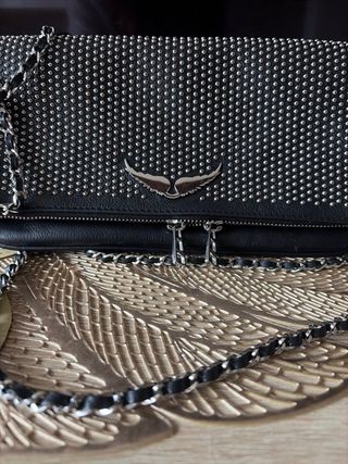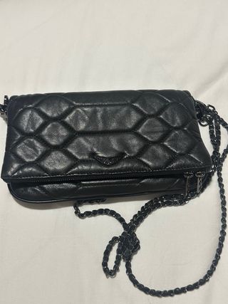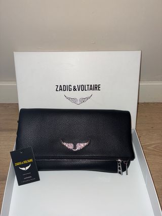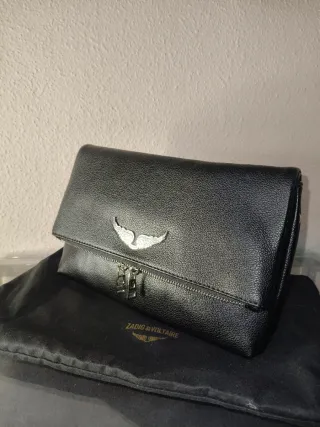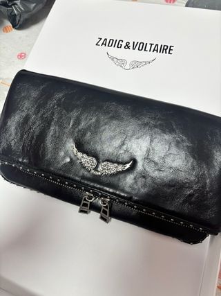 Bolso Rock Zadig & Voltaire negro y plateado. En perfecto estado, como nuevo. Incluye las dos cadenas, la corta y la larga. También añado bandolera ajustable efecto nylon con acabado en cuero y firmas de alas. Dispongo de ticket original. Comprado todo en POLLYANNA (Andorrra), tienda oficial.