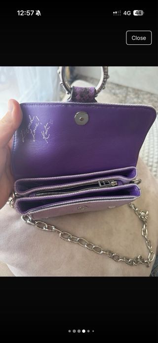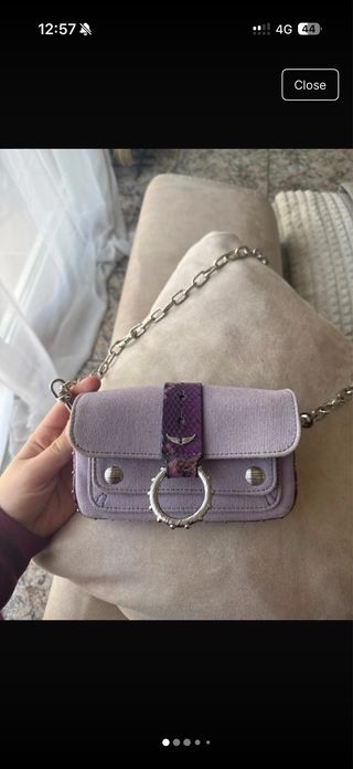 Bolso Zadig & Voltaire, colección Kate Moss 2024 - Diseño en tono lila con detalles en morado. - Cadena metálica plateada. - Adorno frontal con calavera y anilla.