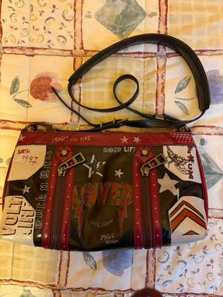 Bolso de mano o bandolera con un diseño rockero. - Adorno de alas plateadas. - Cremallera frontal. - Cadena plateada. - Piel texturizada.