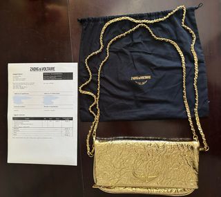 Bolso de mano Zadig & Voltaire con cadena. - Diseño rock wrinkled con acabado metalizado. - Color oro. - Incluye funda guardapolvo. - Con factura de compra.