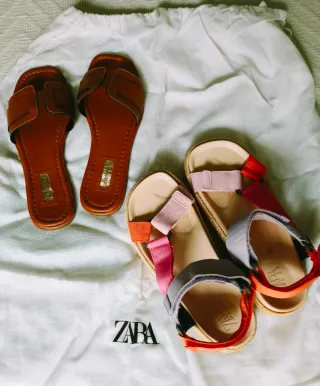 2 sandalias, Zara y Primark + REGALO bolsa tela Zara: - Sandalias marrones PRIMARK planas. Talla 36, algo usadas, muy buen estado (tallan justas, son estrechas). - Sandalias multicolor ZARA tiras. Talla 35. Usadas 2 veces. PERFECTAS. Altura plataforma 4,5cm. - REGALO BOLSA tela ZARA MAS CALZADO EN VENTA EN MI PERFIL