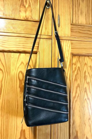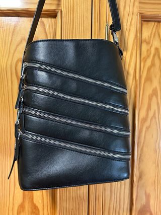 Bolso de Zara que destaca por su diseño urbano, funcional y con un toque "edgy". Es perfecto para quienes buscan organización sin perder el estilo. Vendo este bolso de Zara en color negro, caracterizado por su original frontal con cremalleras metálicas dispuestas en diagonal. Es un modelo muy versátil que combina con todo, desde un look de oficina hasta uno más rockero.