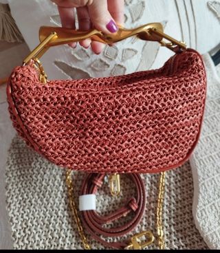 Bolso de mano o bandolera de Zara con un diseño tejido muy original. - Asa superior dorada con forma. - Correa de hombro de piel y cadena dorada. - Cierre de cremallera.
