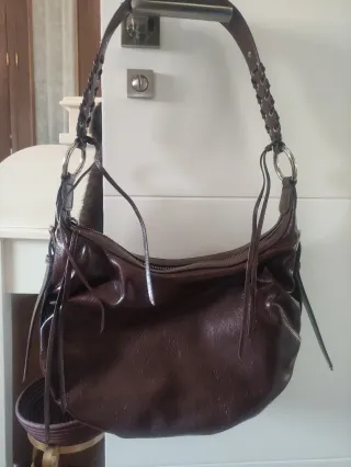 Bolso de mano o bandolera en color marrón. - Incluye un pequeño monedero extraíble. - Correa ajustable. - Cierre de cremallera.