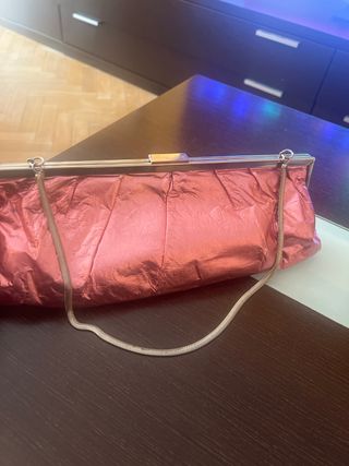 Elegante bolso de fiesta con un diseño llamativo. - Acabado metalizado en tono rosado y dorado. - Cierre de clip metálico. - Cadena fina para llevar al hombro o cruzado.