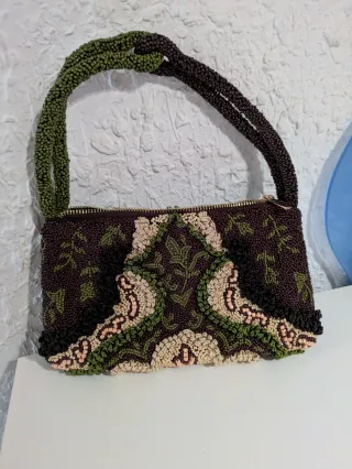 Elegante bolso de mano con un intrincado diseño bordado. - Asa trenzada con cuentas. - Cierre de cremallera. - Detalles de cuentas en relieve.