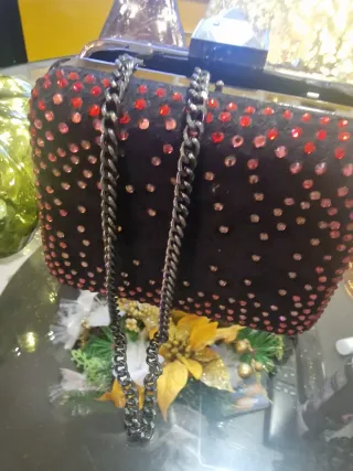 Precioso bolso de mano para eventos especiales, con un diseño elegante sobre fondo negro. - Adornado con pedrería brillante. - Cadena metálica para llevar al hombro o cruzado.