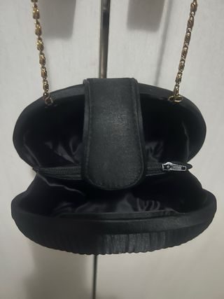 Elegante bolso negro, perfecto para ocasiones especiales. Su diseño combina un acabado satinado con detalles en piel sintética y una cadena dorada. - Cierre de cremallera. - Asa de cadena dorada. - Compartimento interior.