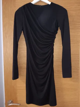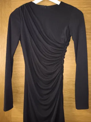 Elegante vestido negro con detalle drapeado. - Diseño asimétrico. - Manga larga. - Largo hasta la rodilla.El bolso es aparte