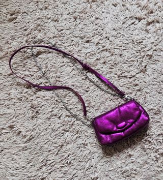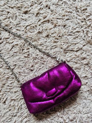 Bolso de fiesta color morado metalizado de Zara. Bolsito pequeño color morado brillante, con 2 correas que se pueden intercambiar dependiendo del estilo que quieras darle. Viene con una cadena plateada y una correa regulable con hebilla a juego con el color del bolso más informal. Muy poco uso, está en perfecto estado. Es pequeño pero cabe el móvil sin pronblema- Cierre de botón magnético y pequeño bolsillo interior