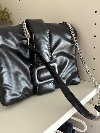 Bolso negro con un diseño acolchado y moderno. - Asa de cadena plateada. - Cierre con hebilla grande. - Material sintético brillante.